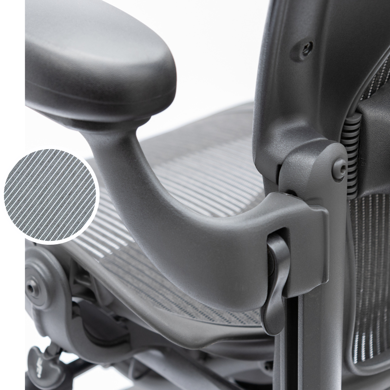 The Herman Miller Aeron Classic chair features Pellicle mesh, a proprietary fabric known for its exceptional durability and breathability. With 200,000 double rubs in abrasion resistance, Pellicle ensures long-lasting performance and comfort. Made from 56% elastomeric and 44% polyester, it offers superior support while meeting stringent flammability standards and maintaining high lightfastness.